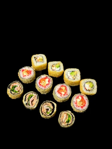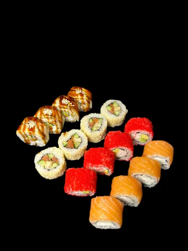 20шт. Роллы: Калифорния спешл, Фудзи, Гунканы запеченные Сяке, Кани, Эби, Тай || Васаби, соус соевый и имбирь в комплект не входят. Просьба гарниры к роллам заказывать дополнительно