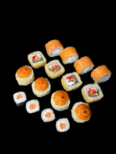 19шт. Роллы: Эби тобико мэджик, Эби макки, Гунканы чиз Кани, Эби, Сяке || Васаби, соус соевый и имбирь в комплект не входят. Просьба гарниры к роллам заказывать дополнительно