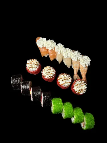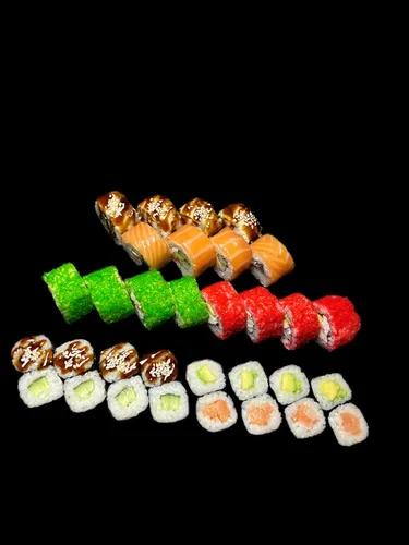 30шт. Роллы: Киото тобико мэджик, Кадзуно, Мидори. Суши филадельфия: Сяке - 2 шт., Тай - 2 шт., Эби - 2 шт. || Васаби, соус соевый и имбирь в комплект не входят. Просьба гарниры к роллам заказывать дополнительно