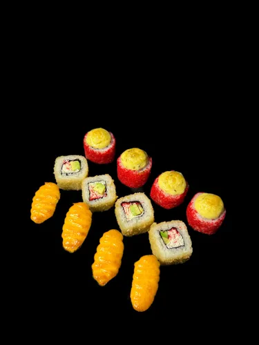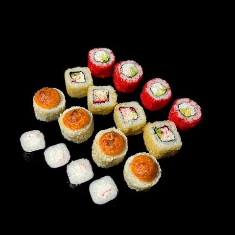 20шт. Роллы: Калифорния спешл, Фудзи, Гунканы запеченные Сяке, Кани, Эби, Тай || Васаби, соус соевый и имбирь в комплект не входят. Просьба гарниры к роллам заказывать дополнительно